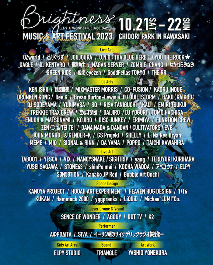 Brightness, a much-loved music and art festival, will hold its 10th anniversary outdoor festival this fall. The festival has recently been held at "Chidori Park," an open space with a vast lawn with a beautiful view of the ocean and the night skyline, not far from the city center. The exhibition has been held at "Chidori Park," a space of openness and openness.